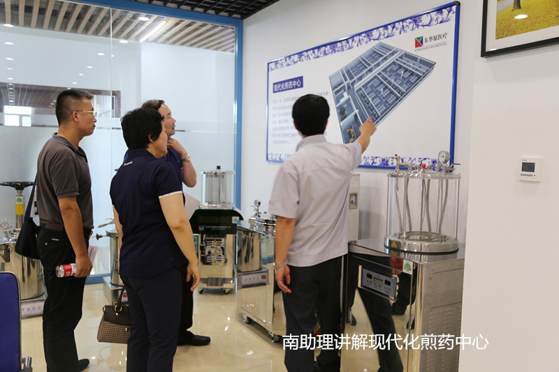 领导们在南助理的带领下先后参观了生产中心,营销中心及研发中心。在生产车间,南助理向来访领导们详细讲解了中药煎药机及医疗产品整个生产线的生产流程及工艺制作,市领导们给予了极大的赞许。宽敞整齐的车间和先进的生产设备,让来访领导们叹为观止。