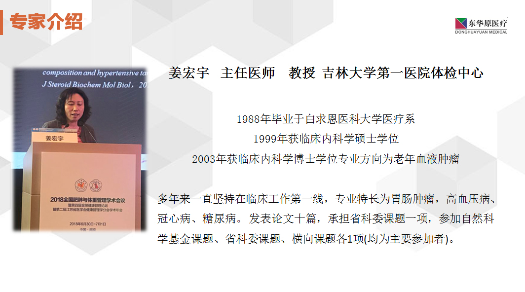 本次大会邀请了健康管理知名专家分享肥胖和体重管理最新研究进展与成果,是继2013年创办以来召开的又一次极具重要意义的学术盛会。大会的优秀论文交流环节中,东华原特邀专家——吉林大学第一医院的姜宏宇教授,分享了《体成分检测在健康管理领域的研究进展》。