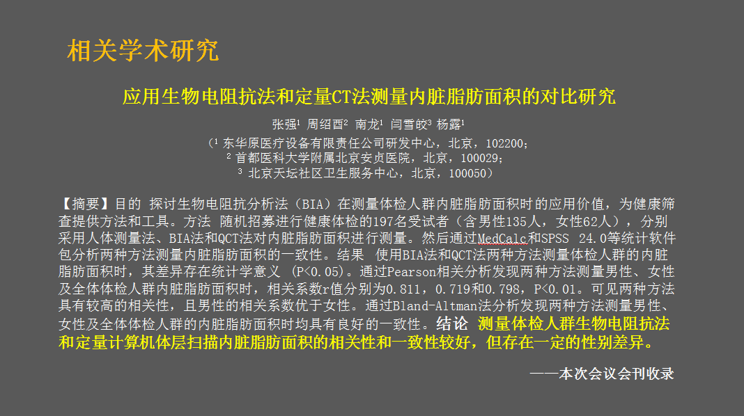 姜教授在讲解中特别介绍了东华原董事长南龙携研发团队编写的论文——《应用生物电阻抗法和定量CT法测量内脏脂肪面积的对比研究》及东华原人体成分分析仪DBA-550的工作原理及测量方法。