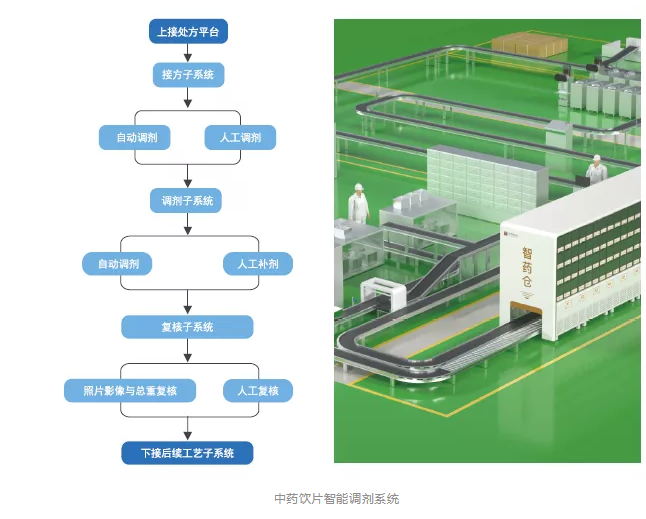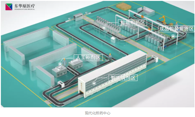 中药的制备和“智”备:现代化煎药中心(智慧中药房)是运用计算机控制、物联网及互联网技术,以煎药、包装设备为中心,将煎药工艺流程(包括处方管理、调剂、浸泡、物料传输、煎药、包装、物流配送)、终端客户服务、设备和人员管理、煎药工艺质量控制等环节进行全过程控制与管理的创新煎药服务模式。