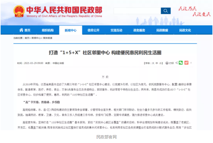根据时代发展需要,江西省南昌市积极响应国家 “健康中国2030”规划,推出“1+5+X”社区邻里中心项目,以党建为引领,以社区为单元,依托党群服务中心,配置1套综合保障体系,配套教育、医疗、养老、商业、文体5类服务业态及快递物业、家政服务、托幼等若干特色衍生业态。目前,南昌市成功打造192个“1+5+X”社区邻里中心,初步构建了便民、惠民、利民的“15分钟社区生活圈”。
