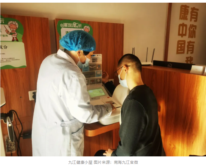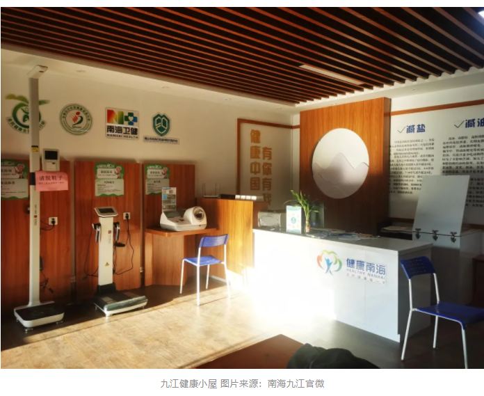 在南海卫健局的指导下,九江镇社区卫生服务中心在南畔社区卫生服务站内建立镇内第一家健康小屋,健康小屋内配备了多种专业医疗设备,如人体成分分析仪、医用电子血压仪、体温枪、超声波身高体重测量仪、脉搏血氧仪等多款亚健康体检仪器,并充分利用大数据、云计算和物联网等先进技术,通过线上健康管理系统帮助居民自助建立健康档案。