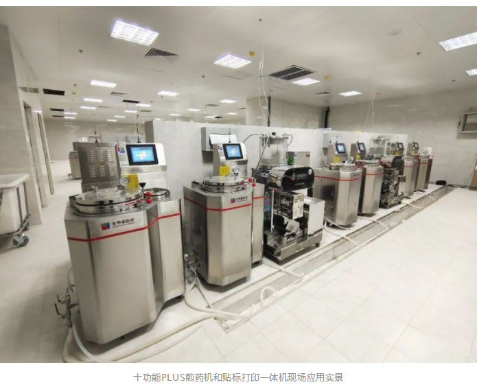 东华原应对中药液包装贴签的便捷化、自动化需求,推出了贴标打印一体机,可自动完成客户信息打印、自动取标、自动贴标操作,完成从中药饮片的煎煮到中药液的包装,再到中药袋贴标的一体化服务。