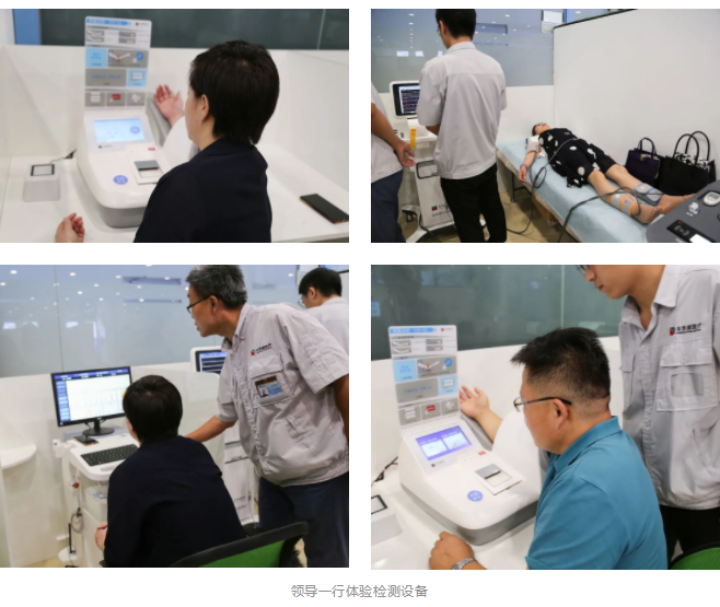 在参观之余,各位领导还亲自体验了医用电子血压仪、精神压力分析仪、动脉硬化检测仪等健康体检设备,肯定了东华原多年来的全系列健康体检设备布局,获得了快速、便捷、专业、舒适的检测体验。