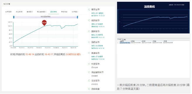 通过软件控制系统和煎药设备的对接,能够记录煎药整个过程的温度变化,相当于“煎药指纹”。煎药温度曲线,以时间为横轴,以温度为纵轴,记录开锅时间、出药时间和开锅后煎药时间。煎药时间从沸点时间起算,时间掌控更加精确。杜绝其他类似系统可通过条码枪扫码造假的可能性,追溯功能无可争议。