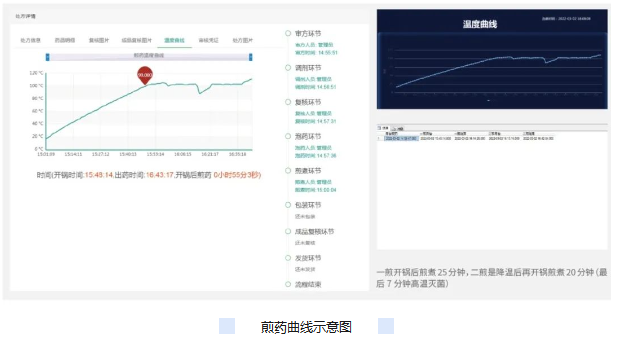 通过软件控制系统和煎药设备的对接,能够记录煎药整个过程的温度变化,相当于“煎药指纹”。煎药温度曲线,以时间为横轴,以温度为纵轴,记录开锅时间、出药时间和开锅后煎药时间。煎药时间从沸点时间起算,时间掌控更加精确。