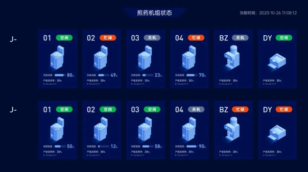 煎药大数据平台可对智慧中药房统计管理,包括煎药机组作业状况管理、调剂、传送带等设备作业状况管理、库存信息统计管理、医疗机构对账信息统计管理、煎煮过程数据存储及管理、异常及预警信息管理及相关报表的自定义、自动生成。