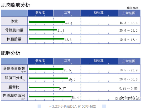 东华原人体成分分析仪正是通过生物电阻抗测量方法测量并分析人体各项成分,如蛋白质、总水分、体脂肪量、内脏脂肪面积、节段脂肪、身体质量指数、骨骼肌肉量等多种指标,并给出肌肉评估、肥胖评估、营养评估等多种和身体健康紧密相关的健康评估,人体成分分析仪高端型号DBA-610,在出具人体成分报告之外,还可提供人体水分分析报告和身体围度等多种报告,为患者调整生活方式、关注自身身体变化提供参考依据。