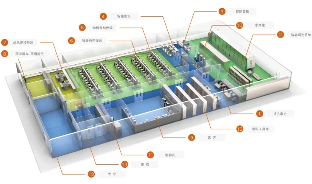 现代化智慧中药房整体解决方案将大数据、物联网等技术与中医药深度融合,解决当前中医药事服务中的煎药工艺质量控制难、工艺数据追溯难和煎药过程监管难等痛点问题;并针对中药饮片人工调剂面临的劳动强度大、工作效率低、存在人为出错、拿药排队等候时间长等问题,研发了中药饮片智能调剂系统,依靠数字化计算机管理以及精准定位传导控制,实现了从处方、煎煮、包装直至送货上门的一条龙优质服务,让中药饮片入库、调剂、煎制、药品配送全程数字化、智能化、透明化。