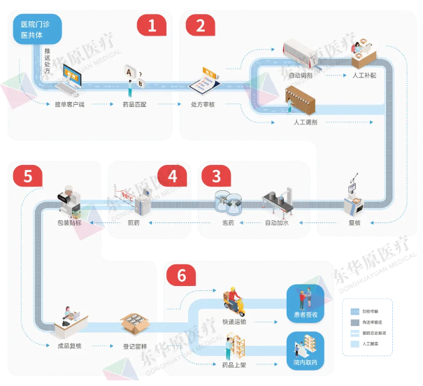 针对中药饮片人工调剂面临的劳动强度大、工作效率低、存在人为出错、拿药排队等候时间长等问题,东华原还研发了中药饮片智能调剂系统,依靠数字化计算机管理以及精准定位传导控制,实现了从接方、审方,到煎煮、包装,直至送货上门的一条龙优质服务,让中药饮片入库、调剂、煎制、药品配送全程数字化、智能化、透明化。