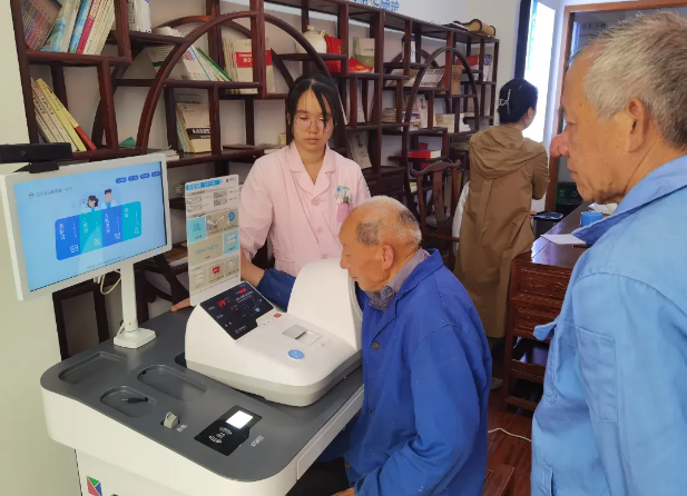 走进“健康小屋”,映入眼帘的是健康管理一体机设备,群众可自助检测身高、体重、体脂含量、血压、心率、血糖、血氧、尿酸等多项重要指标,设备还会自动打印监测结果,及时独立完成自我健康监测,操作简单,方便了很多慢性病患者,实现“小病不出村,健康提前管”的“家门口”健康服务需求。