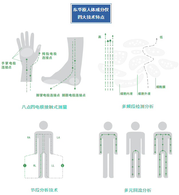 东华原人体成分分析仪采用8点接触式4电极生物电阻抗检测方法(BIA),对人体各节段体成分进行测量,可在一分钟内将人体中的成分进行准确的检测,评估受测者身体的健康状况,为受测者提供精准的健康分析数据。