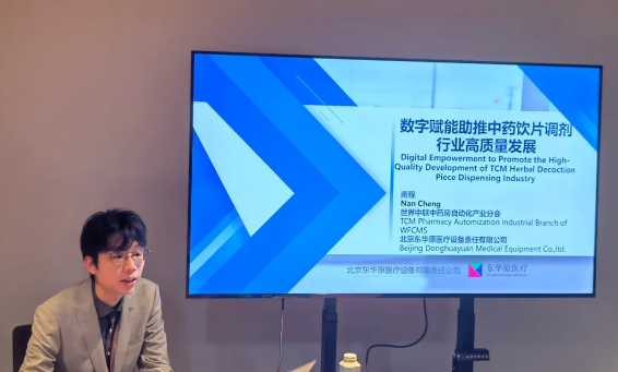 在中药调剂传承和创新分会场,东华原常务副总经理南程作“数字赋能推动中药调剂高质量发展”专题报告,对中药调剂的发展背景、发展现状进行详细分析,同时对比国际中药调剂的发展趋势,对未来中药调剂的发展趋势进行预测。搭建全流程药事服务管理已成为中医药的发展趋势,南程总在报告中,向全世界的中医药人展示了东华原在中药房数字化、自动化、标准化、智能化方面取得的先进成果。