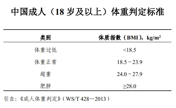 体质指数(body mass index,BMI)是衡量人体胖瘦程度的标准,BMI=体重(kg)/身高(m)2。根据中国18 岁及以上成人 BMI 评判标准,我国健康成年人的BMI 正常范围为 18.5kg/m2≤BMI<24.0kg/m2,BMI<18.5kg/m2为体重过低,24.0kg/m2≤BMI<28.0kg/m2为超重,BMI≥28.0kg/m2为肥胖。脂肪在腹部蓄积过多称为中心型肥胖,可根据腰围直接判定。