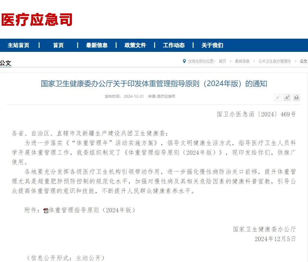 近日,卫健委发布《体重管理指导原则(2024年版)》(以下简称《原则》),旨在进一步落实《“体重管理年”活动实施方案》,强化慢性病防治关口前移,倡导文明健康生活方式,加强对慢性病及其相关危险因素的健康科普宣教,指导医疗卫生人员科学开展体重管理工作。