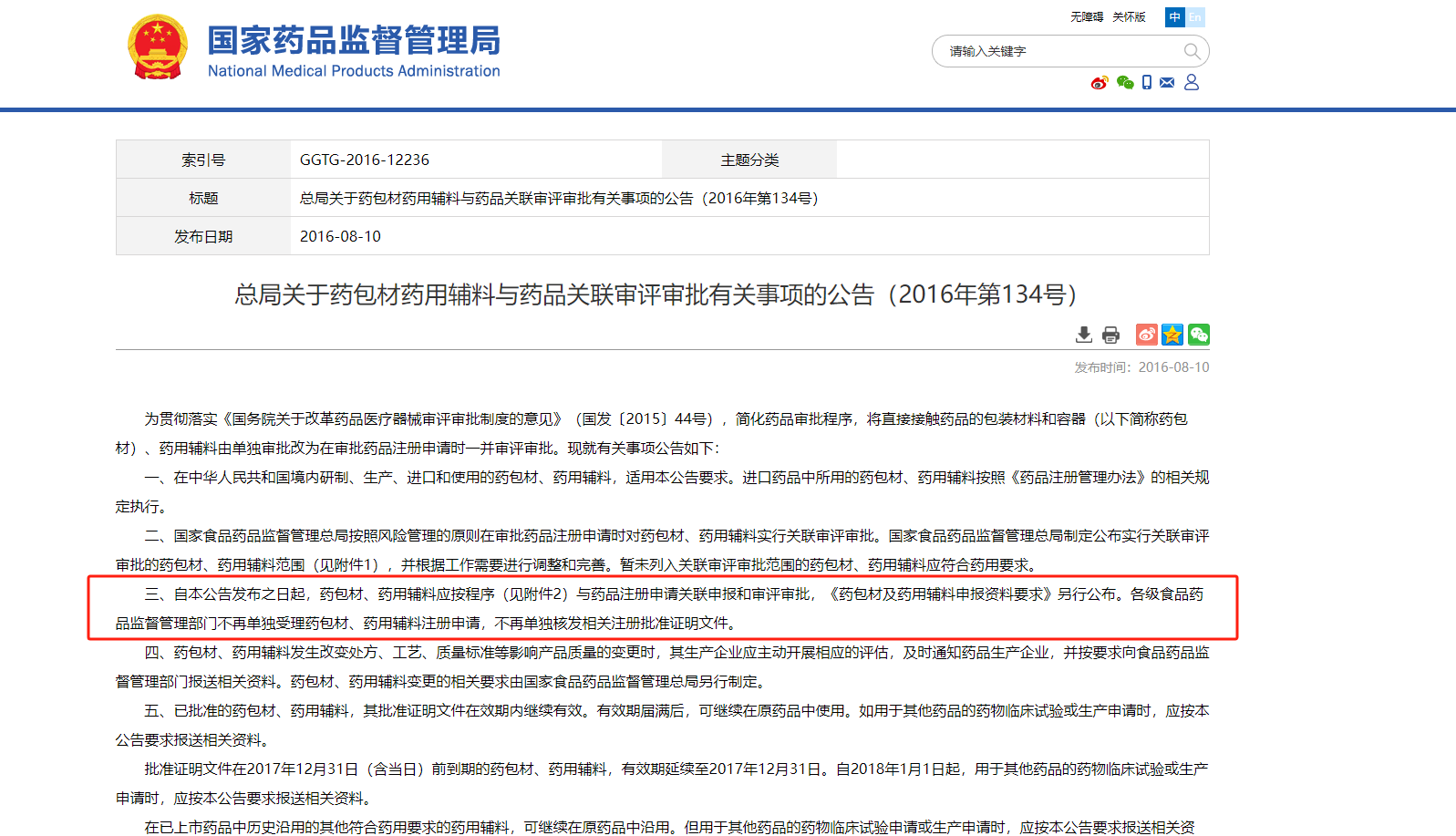 2016年,国家药品监督管理局发布《总局关于药包材药用辅料与药品关联审评审批有关事项的公告》第三条内容规定,药包材应按程序与药品注册申请关联申报和审评审批,各级食品药品监督管理部门不再单独受理药包材、药用辅料注册申请,不再单独核发相关注册批准证明文件。