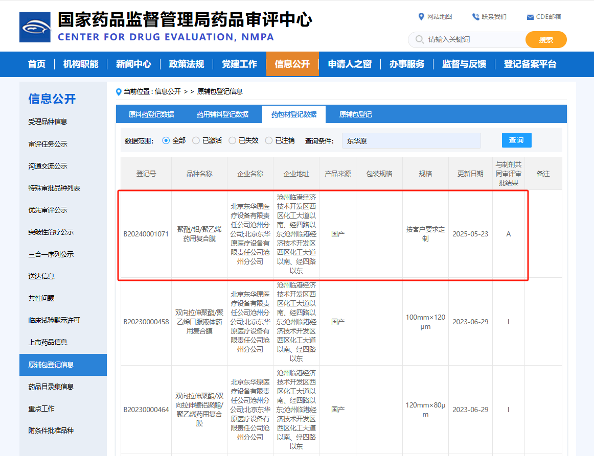 东华原一直以高标准、严要求进行聚酯/铝/聚乙烯药用复合膜的生产。此次聚酯/铝/聚乙烯药用复合膜获“A”级公示,标志着该产品在安全性、功能性及合规性方面达到国家药品包装材料的高标准,彰显出东华原在生产工艺和质量控制上的严格要求,为药品质量保障再添权威背书。
