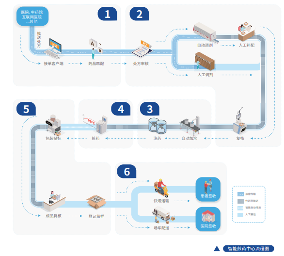 该方案基于大数据、云计算等新一代信息技术,从全流程服务监控、饮片质量控制、临床诊疗水平提升、汤剂质量控制、患者用药交代与反馈等角度出发,可以搭建院内和院外多场景、多模式下的不同智慧中药房:可根据客户需求量身定制突出自动化、智能化的全自动煎药生产线方案;注重有效成分提取率的滚筒煎药机方案;制作丸、散、膏、汤等的多剂型服务方案等。