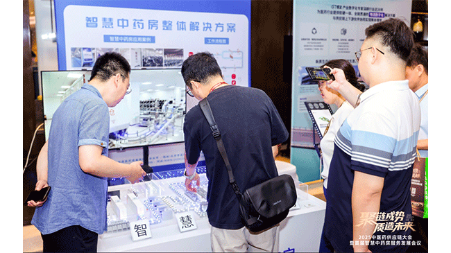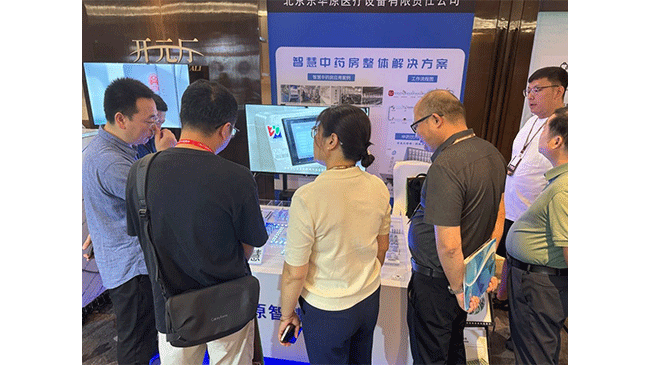 工作人员向与会专家、同行介绍东华原智慧中药房整体解决方案