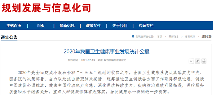 近期,规划发展与信息化司发布《2020年我国卫生健康事业发展统计公报》。公报从卫生资源、医疗服务、基层卫生服务、中医药服务、病人医药费用、疾病控制与公共卫生、妇幼卫生与健康老龄化、食品安全与卫生监督、人口家庭发展九个方面展开,其中中医药服务中,从中医类机构、床位及人员数、中医医疗服务等与2019年做了详细对比。