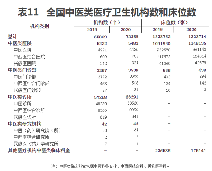 2020年末,全国中医类医疗卫生机构总数达72355个,比上年增加6546个。其中:中医类医院5482个,中医类门诊部、诊所66830个,中医类研究机构43个。与上年比较,中医类医院增加250个,中医类门诊部及诊所增加6295个。
