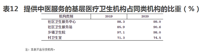 2020年末,提供中医服务的社区卫生服务中心占同类机构的99.0%,社区卫生服务站占90.6%,乡镇卫生院占98.0%,村卫生室占74.5%。