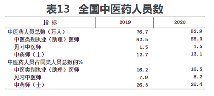 2020年末,全国中医药卫生人员总数达82.9万人,比上年增加6.2万人(增长8.0%)。其中:中医类别执业(助理)医师68.3万人,中药师(士)13.1万人。两类人员较上年均有所增加。