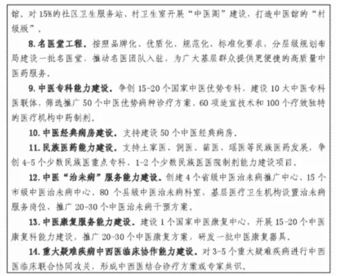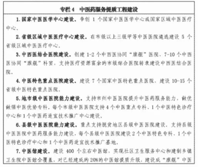 此外,依托高水平三级甲等中医医院,建设1家国家中医疫病防治基地;建设1家国家中医紧急医学救援基地;争创1个国家中医医学中心或国家区域中医医疗中心;建设1个国家中医康复中心;争创1个国家中医药传承创新中心、1个国家中医药管理局重点实验室、1个国家药品监督管理局重点实验室。