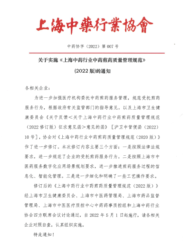 第三十九条 本规范自2022年5月1日起施行,《上海中药行业中药煎药质量管理规范》(2020版)同时废止。