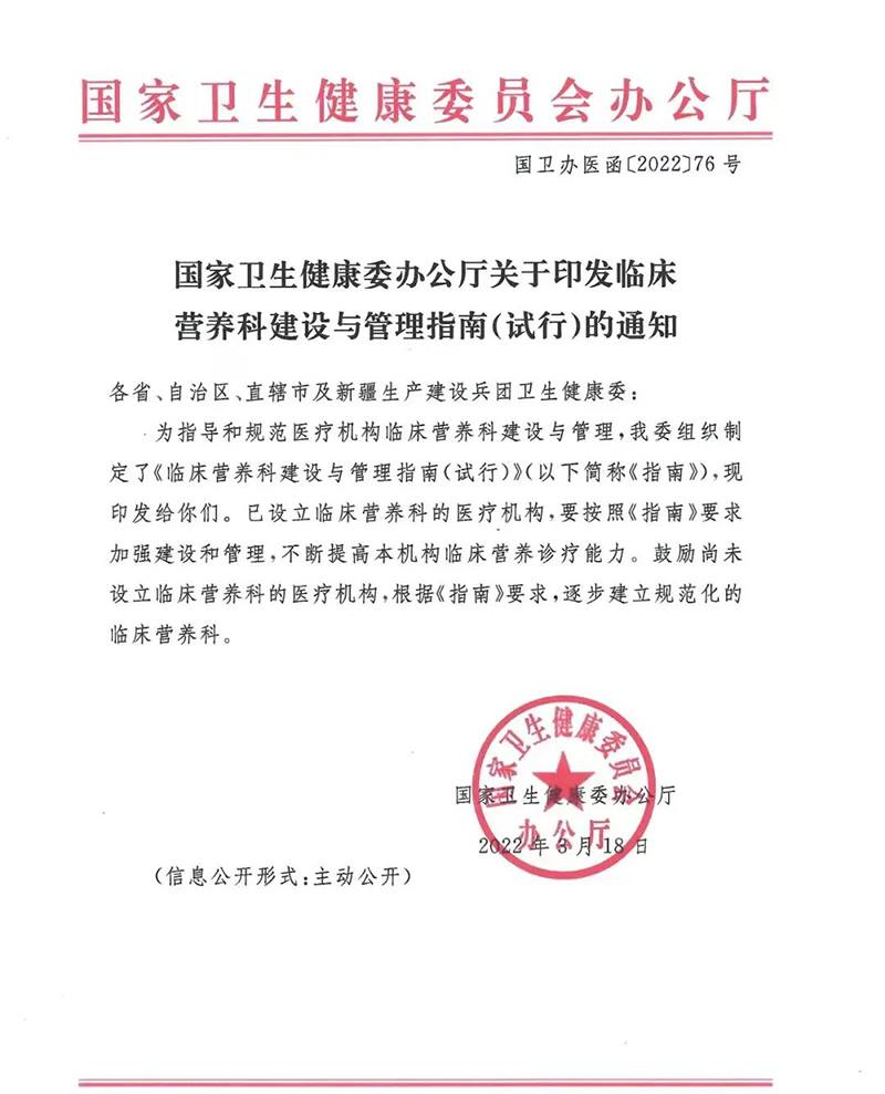 国家卫健委发布《临床营养科建设与管理指南》通知。通知全文如下: