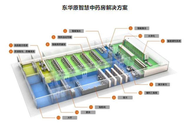 东华原智慧中药房解决方案是运用计算机控制、物联网及互联网技术,以煎药、包装设备为中心,将煎药工艺的多个流程、终端客户服务、设备和人员管理、煎药工艺质量控制等环节进行全过程控制与管理的创新煎药服务模式。据悉,东华原医疗智慧中药房(现代化煎药中心)解决方案目前已在全国落地300余家,成为中医药现代化的中坚力量。典型案例:山东宏济堂、浙江桐君堂、上海康桥中药、北京太洋树康、江西同善堂等。