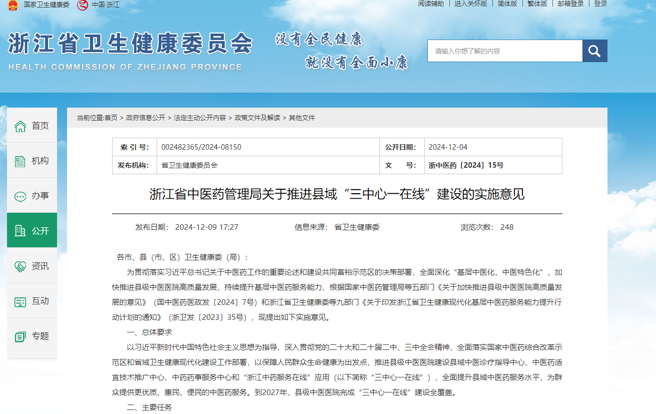 浙江推进县域“三中心一在线”建设全覆盖 全面提升县域中医药服务水平