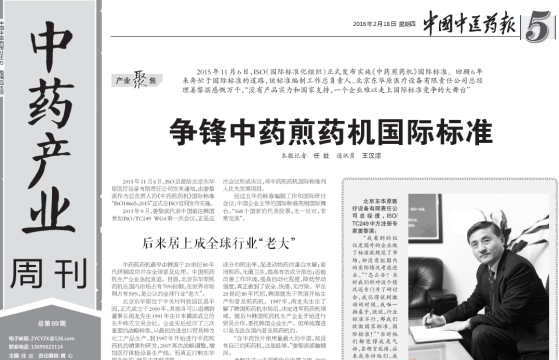 2015年11月6日,ISO(国际标准化组织)正式发布实施《中药煎药机》国际标准。回顾6年来奔忙于国际标准的道路,该标准编制工作总负责人、万象城官网总经理姜黎滨感慨万千,“没有产品实力和国家支持,一个企业难以走上国际标准竞争的大舞台”。