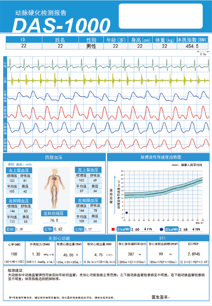 东华原医疗动脉硬化检测仪用于全身动脉硬化和动脉粥样硬化的早期检测和血管疾病的检测和评估,采用示波法、参数分析法及弹性腔理论法,结合脉搏波波形图、PWV与年龄趋势分析示意图、四肢血压图、ABI分析示意图、STI心功能评估图等多个信息,为动脉硬化临床提供多项参考指标。