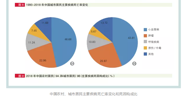 城乡居民疾病死亡构成比中,心血管病占首位。2018年农村、城市心血管病分别占死因的46.66%和43.81%。每5例死亡中就有2例死于心血管病。