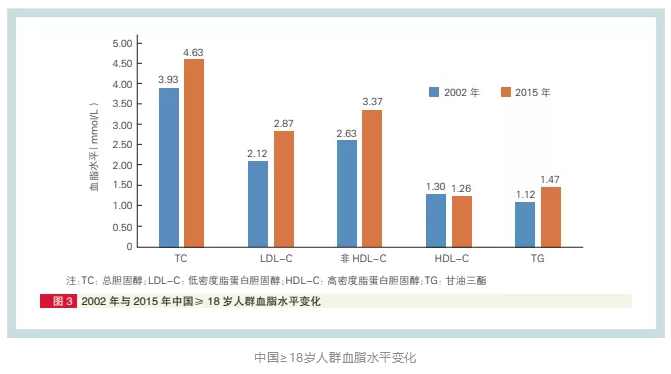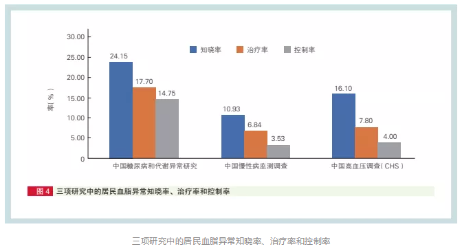对于成年人来说,数据一样不容乐观。现阶段我国成年人血脂异常知晓率、治疗率和控制率总体仍处于较低水平。2012—2015年CHS调查显示,中国≥35岁成人对血脂异常的知晓率为16.10%、治疗率为7.80%、控制率为4.00%。