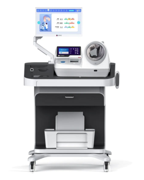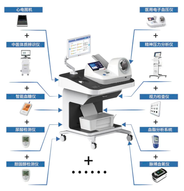 健康管理一体机应用互联网、物联网及多种信息识别和信息传输技术,采集受测人员的多项身体体征数据,进行信息收集、分类、储存和分析,将个人信息及健康档案实时上传至管理工作站,实现慢性病人群的分类与持续管理,并支持上传至公共卫生管理服务平台和HIS等医疗信息化平台。