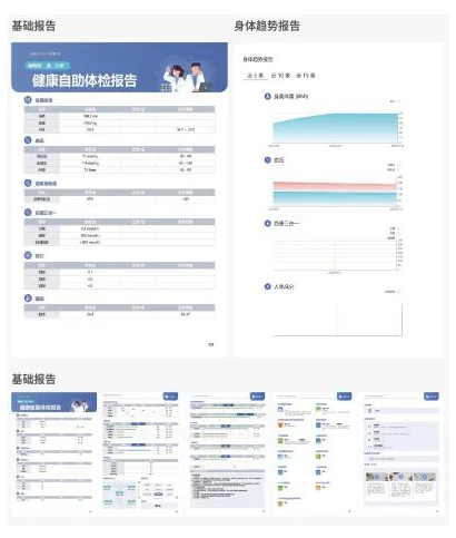 ●评估分析:对健康检测数据进行汇总分析●输出报告:输出基础报告和趋势报告。其中趋势报告可展现近5次、近10次和近15次的历史数据走向示意图●输出方式:支持通过打印、自助查询、APP、小程序、公众号、邮件等方式输出结果报告。