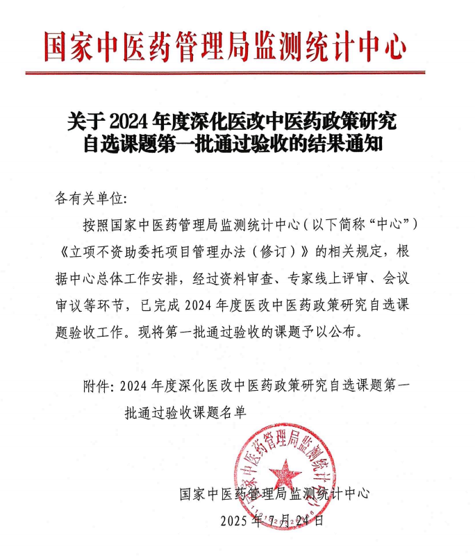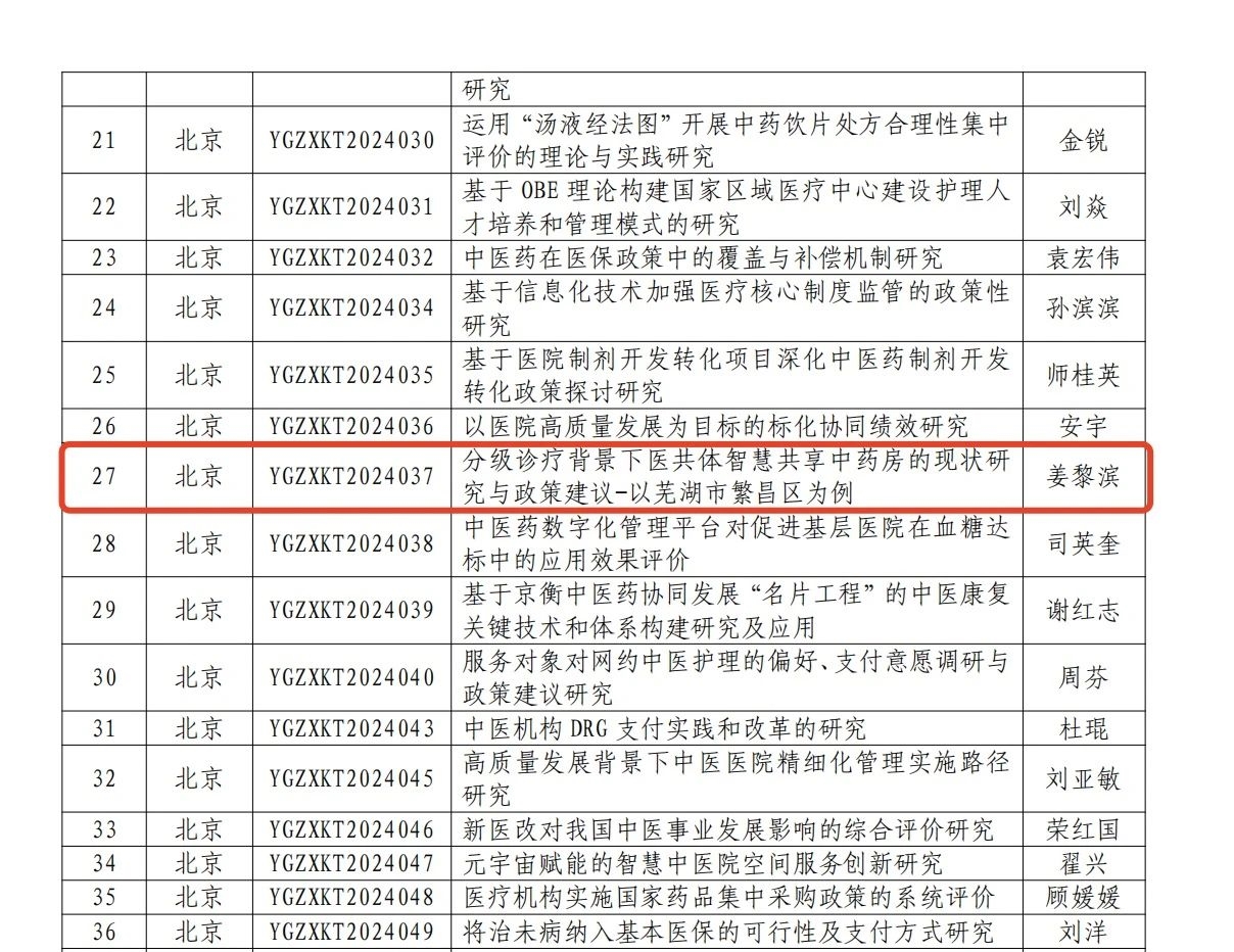 近日,国家中医药管理局监测统计中心发布《关于2024年度深化医改中医药政策研究自选课题第一批通过验收结果的通知》文件,公布了2024年度第一批通过验收的课题名单,万象城官网总经理姜黎滨申请的《分级诊疗背景下医共体智慧共享中药房的现状研究与政策建议-以芜湖市繁昌区为例》课题项目通过验收。