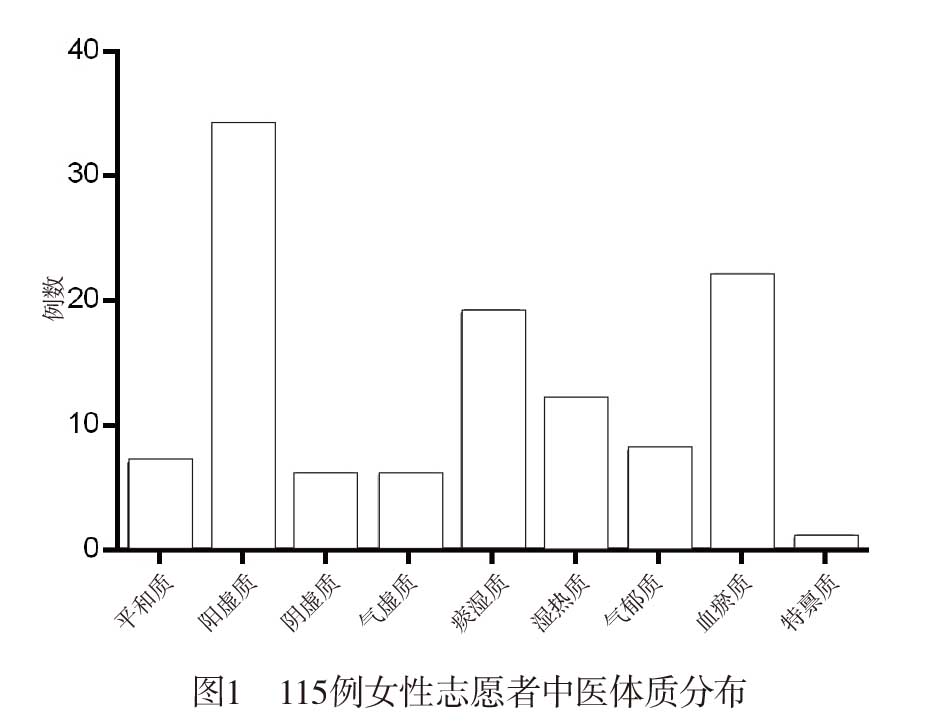 1. 体质分布基本特征 见图1。115例女性志愿者,其中平和质7例(6.1%),阳虚质34例(29.6%),阴虚质6例(5.2%),气虚质6例(5.2%),痰湿质19例(16.5%),湿热质12例(10.4%),气郁质8例(7.0%),血瘀质22例(19.1%),特禀质1例(0.9%)。其体质类型分布最多的前3位分别是阳虚质、血瘀质和痰湿质。
