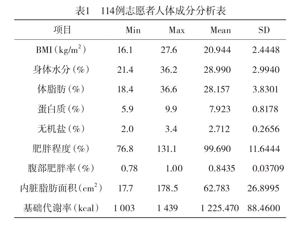 2. 人体成分基本特征 见表1。人体成分分析仪共记录了114例女性志愿者的BMI、体脂肪、身体水分、蛋白质,无机盐,肥胖度、腹部肥胖率、内脏脂肪面积、基础代谢率9个指标。