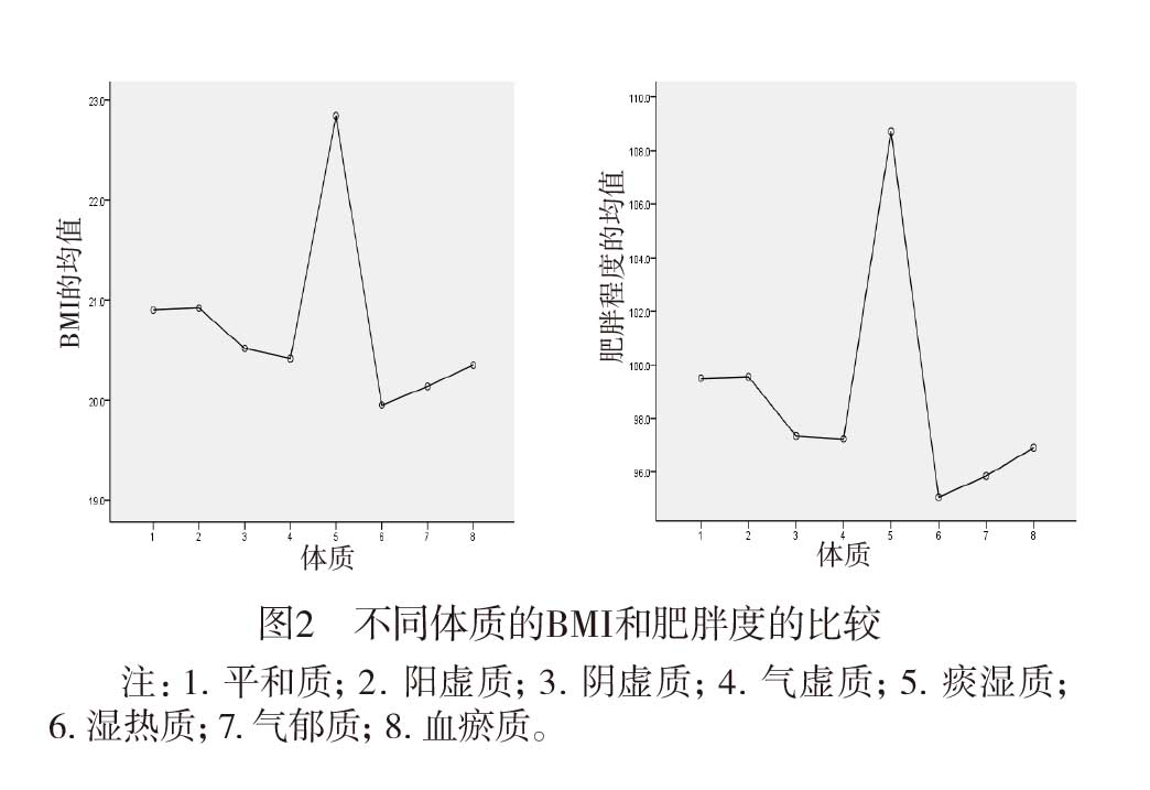 3.2.2 肥胖程度:见图2。将8种不同体质组的肥胖程度进行比较,通过方差分析F=2.482,肥胖度的不同体质的分布有统计学差异(P<0.05),且痰湿质的肥胖程度与其他体质相比最高。
