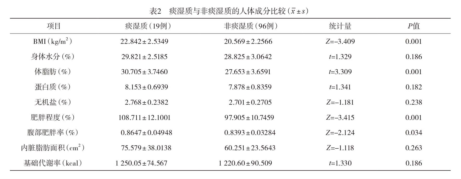 结果:115例女性受试者中阳虚质分布最多(29.6%),其次是血瘀质(19.1%)和痰湿质(16.5%),特禀质较少(0.9%);痰湿质的BMI、体脂肪、肥胖程度、腹部肥胖率均要高于非痰湿质(P<0.05);平和质、血瘀质、阳虚质、气虚质、阴虚质、湿热质、气郁质在BMI、体脂肪、肥胖程度等人体成分指标上没有差异;在身体水分方面,痰湿质与非痰湿质、湿热质与非湿热质、阳虚质与阴虚质的身体水分无差别。结论:BMI、体脂肪、肥胖程度、腹部肥胖率越高的人,痰湿体质的可能性越大;平和质、血瘀质、阳虚质、气虚质、阴虚质、湿热质、气郁质形体胖瘦无明显区别;中医的“湿”与人体成分中的身体水分不能混为一谈。