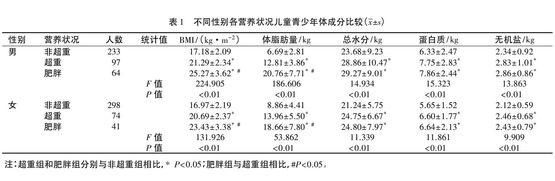 2.1 不同营养状况儿童青少年体成分比较 807 名中小学生中,非超重组531 名,占65.8%,其中男生233名,女生 298 名;超重组 171 名,占 21.2%,其中男生 97名,女生 74 名;肥胖组 105 名,占 13.0%,其中男生 64名,女生 41 名。经正态分布检验,男、女生不同营养状况的体成分均符合正态分布。由表1 可见,男、女生不同营养状况组间体成分差异均有统计学意义(P 值均<0.01)。儿童青少年的 BMI、体脂肪量、总水分、蛋白质、无机盐均值均为肥胖组、超重组>非超重组,不论男女,差异均有统计学意义(t 男 值分别为 - 17. 102,- 14. 341,-4.307,-4.385,-4.088,-14.969,-14.129,-4.235,-4.290,-4.094;t 女 值分别为 11.901,7.876,2.765,2.852,2.470,12.846,7.406,4.552,4.649,4.315,P 值均<0.05);肥胖组和超重组相比,除女生的无机盐含量均值超重组>肥胖组,其他均为肥胖组>超重组,但是仅 BMI 和体脂肪量差异均有统计学意义(t 男 值分别为 -7.780,-7.646;t 女 值分别为 -5.096,-3.771,P 值均<0.05)。