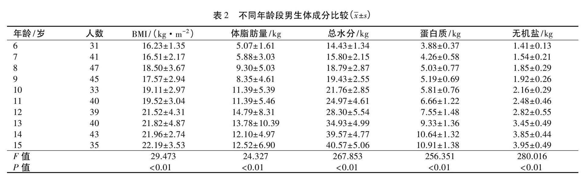 2.2 不同年龄段儿童青少年体成分比较 见表 2~3。