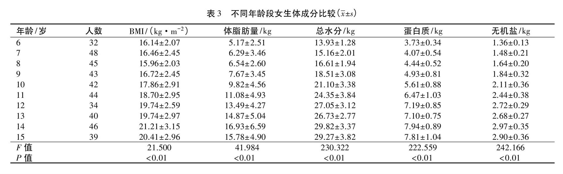 由表 2~3 可见,男、女生的 BMI 逐年增长,差异均有统计学意义(P 值均<0.01);男生每个年龄段的 BMI都高于女生,仅 8,12,13,15 岁的差异均有统计学意义(t 值分别为 4.141,2.167,3.261,2.348,P 值均<0.05)。男生 6~12 岁阶段的体脂肪量逐年增加,13 岁开始逐年减少,女生的体脂肪量逐年增加,差异均有统计学意义(P 值均<0.01);12 岁之前男生体脂肪量均值大于女生,13 岁以后体脂肪量均值小于女生,其中8,14,15 岁的差异均有统计学意义(t 值分别 3.321,-3.882,-2.359,P 值均<0.05)。男、女生的总水分、蛋白质、无机盐均值逐年增加,差异均有统计学意义(P 值均<0.01);男生每个年龄段以上 3 种体成分的均值都大于女生,其中 8,13,14,15 岁的差异均有统计学意义(t 值分别为 4.232,10.064,11.202,10.738,P 值均<0.05)。