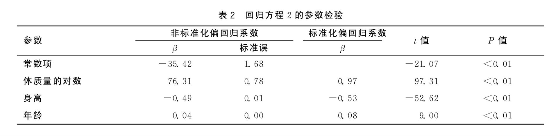 最优回归方程1:体脂肪率=-37.97+76.36log(体质量)-0.44×身高+0.06×年龄,R2为0.94,F=6 366.77(P<0.01),以α=0.05为检验水准,回归方程及其参数均有统计学意义。见表1。