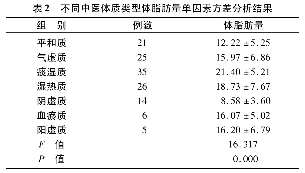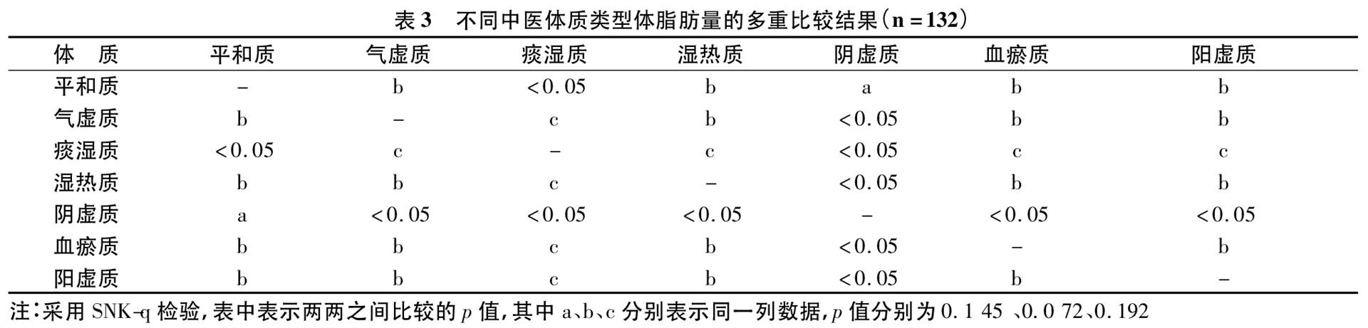 表3 显示,体脂肪量均值从小到大的顺序为阴虚质、平和质、气虚质、血瘀质、阳虚质、湿热质、痰湿质,说明痰湿质人群体脂肪量含量最高,阴虚质人群含量最低。组间比较,平和质和痰湿质、阴虚质和气虚质、阴虚质和痰湿质、阴虚质和湿热质、阴虚质和血瘀质、阴虚质和阳虚质比较差异有统计学意义。