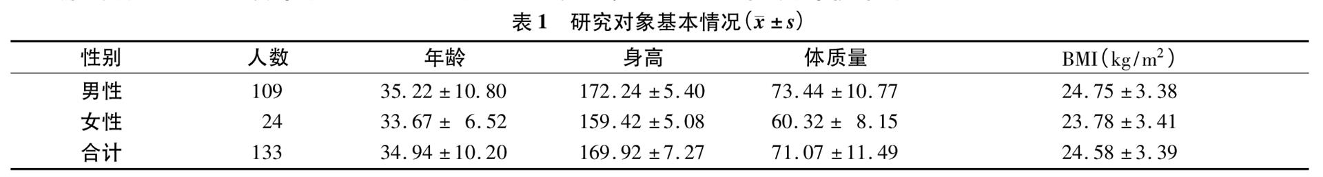 表1 显示,选取2016 年1 月4 日至2016 年1月23 日健康体检企业员工157 名,年龄18 ~ 60 岁,排除重要脏器病史、精神类疾病和代谢性疾病,排除佩戴人工心肺机、人工心脏等体内移植型医疗用具者; 排除带环的女士、生理期女性及孕妇; 排除病情严重者及因文化程度等原因不能理解调查问卷内容者。所有人员均在知情的情况下参与此次临床检测,最终133 例志愿者数据有效,其中男性109 人,女性24 人。