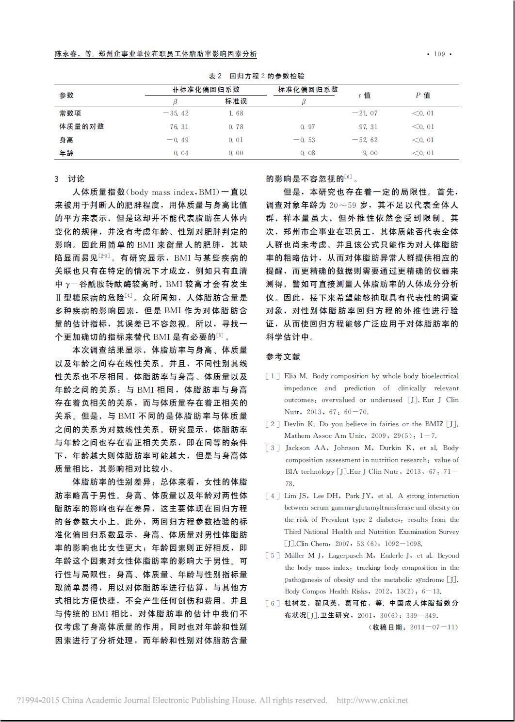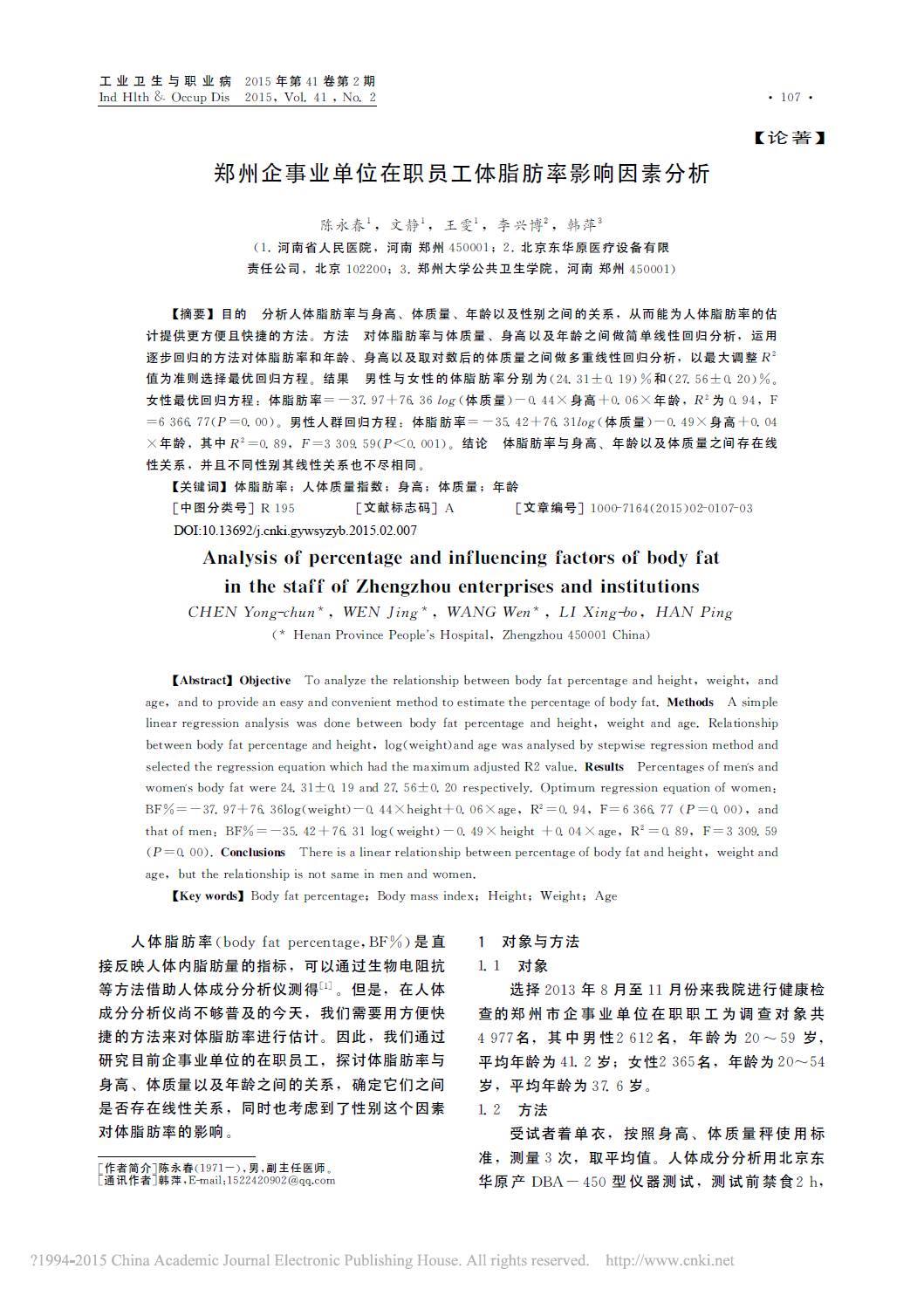 郑州企事业单位在职员工体脂肪率影响因素分析